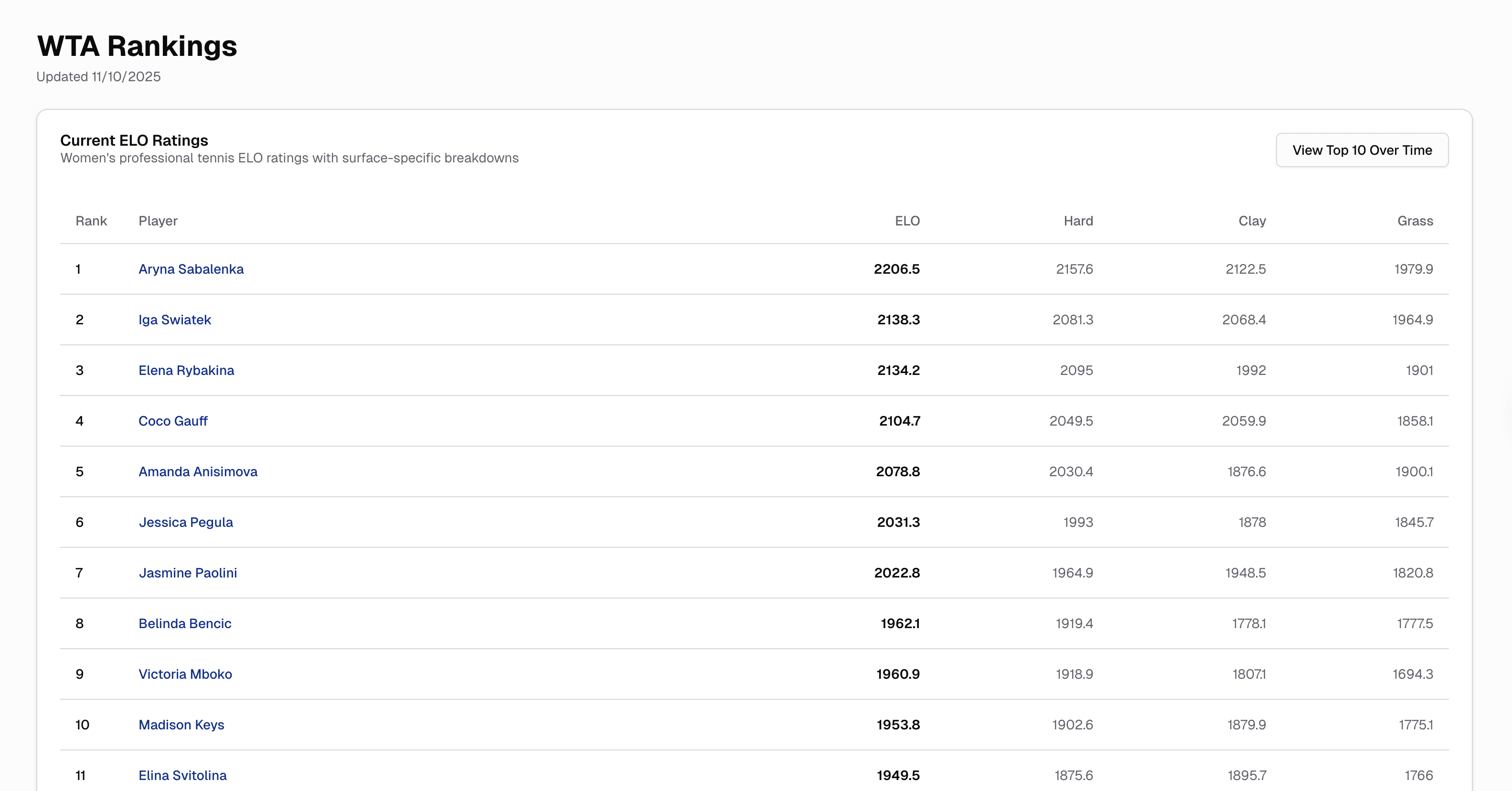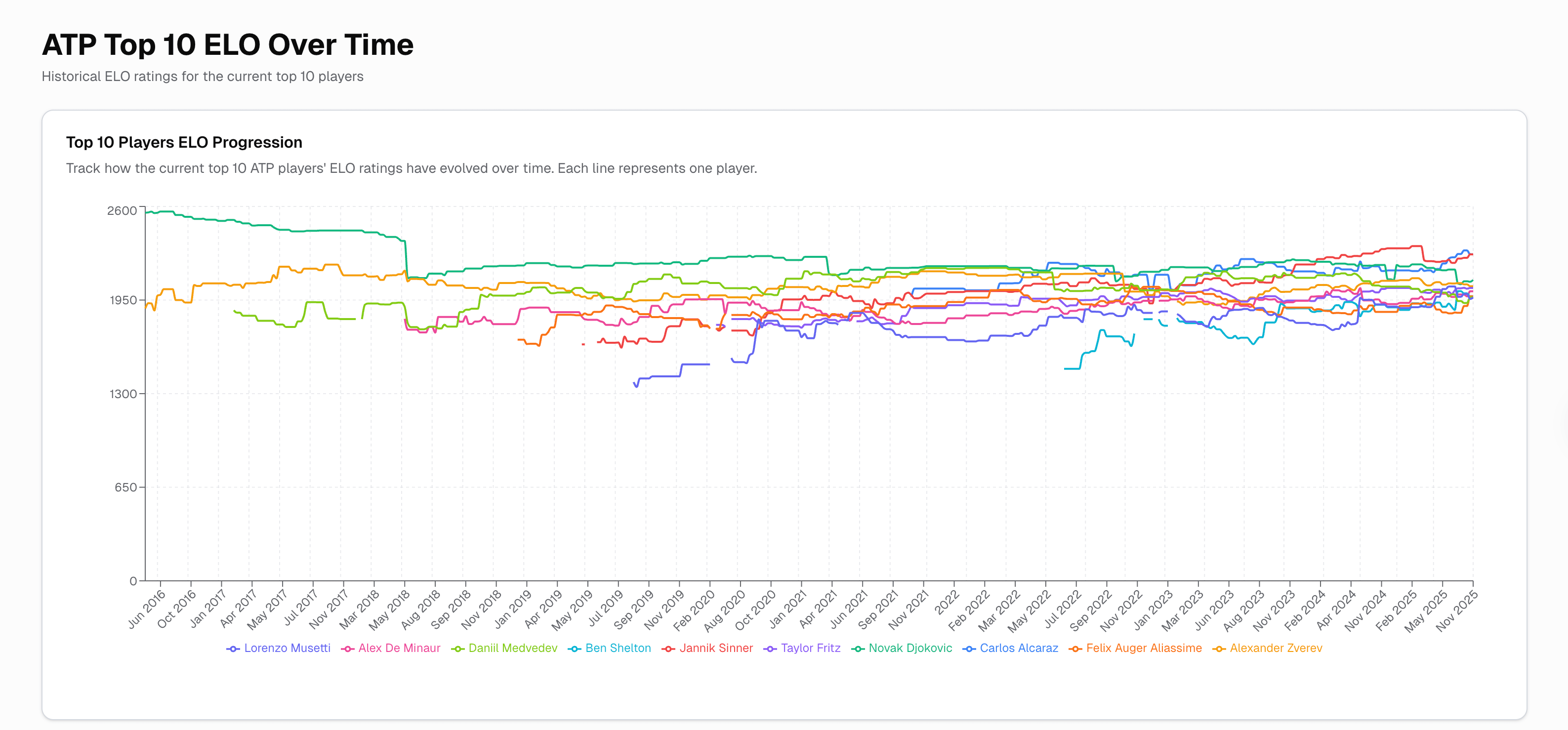 I'm a big believer in Elo ratings as an approach for modelling fitness (having used them in my dissertation and other projects I can't talk about). I've been working on an pretty simple dashboard for exploring tennis players Elo ratings based on this fantastic resource](https://tennisabstract.com/reports/atp_elo_ratings.html).